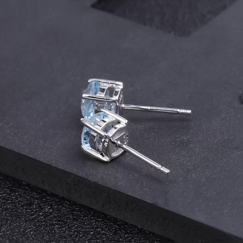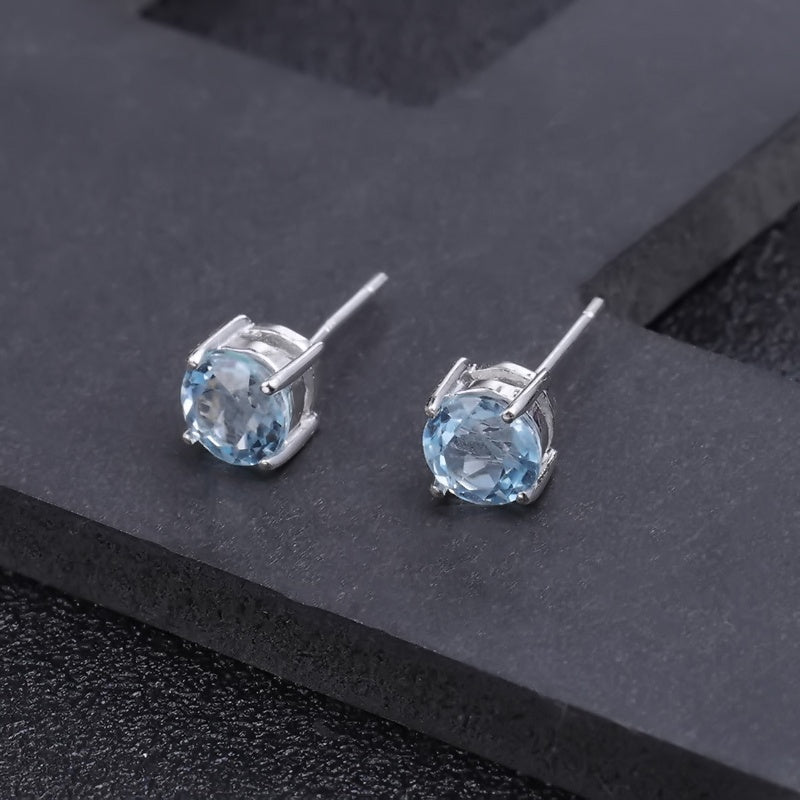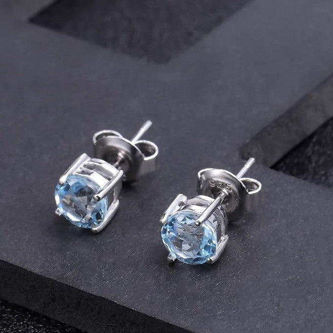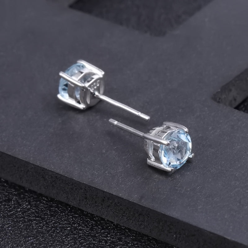 These luminous Blue Topaz stud earrings embody the tranquil beauty of the November birthstone. Each 1.05ct round brilliant-cut Blue Topaz shimmers with a serene sky-blue hue, symbolising love, affection, and emotional clarity. The gemstones are set in a refined 4-claw basket crafted from 925 Sterling Silver and finished with rhodium plating for enhanced brilliance, durability, and a hypoallergenic touch. Their timeless design and captivating colour make them an elegant choice for both everyday wear and treasured occasions.