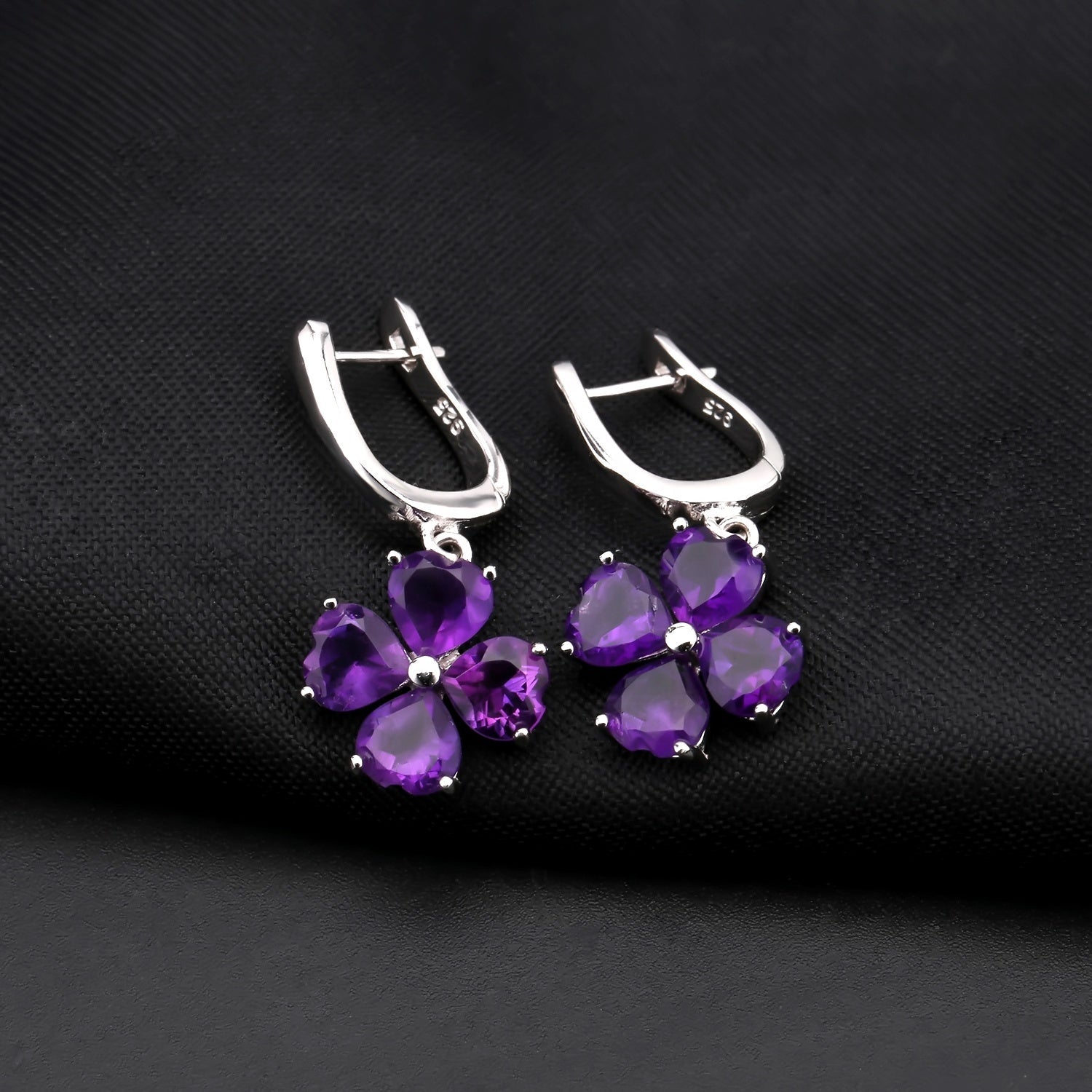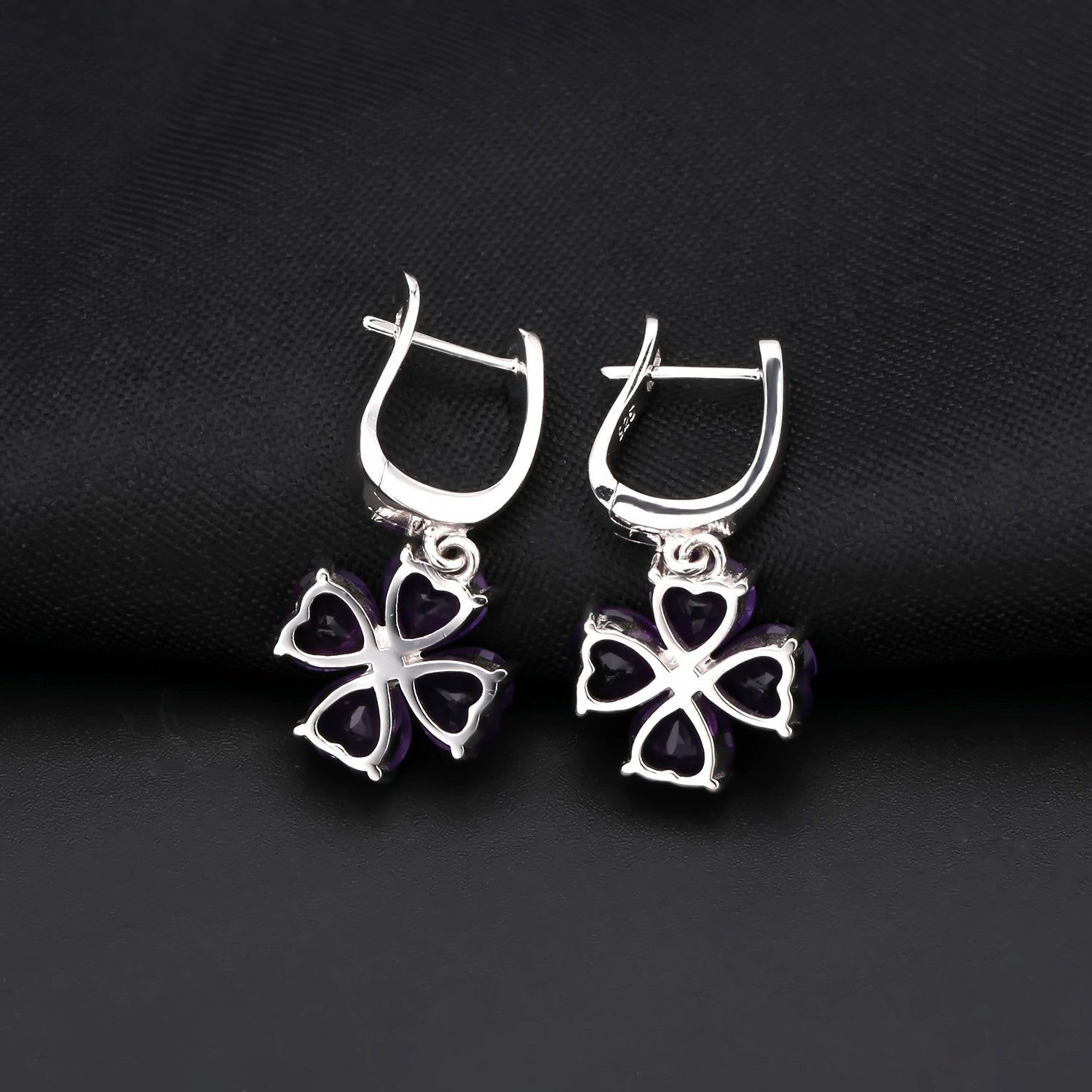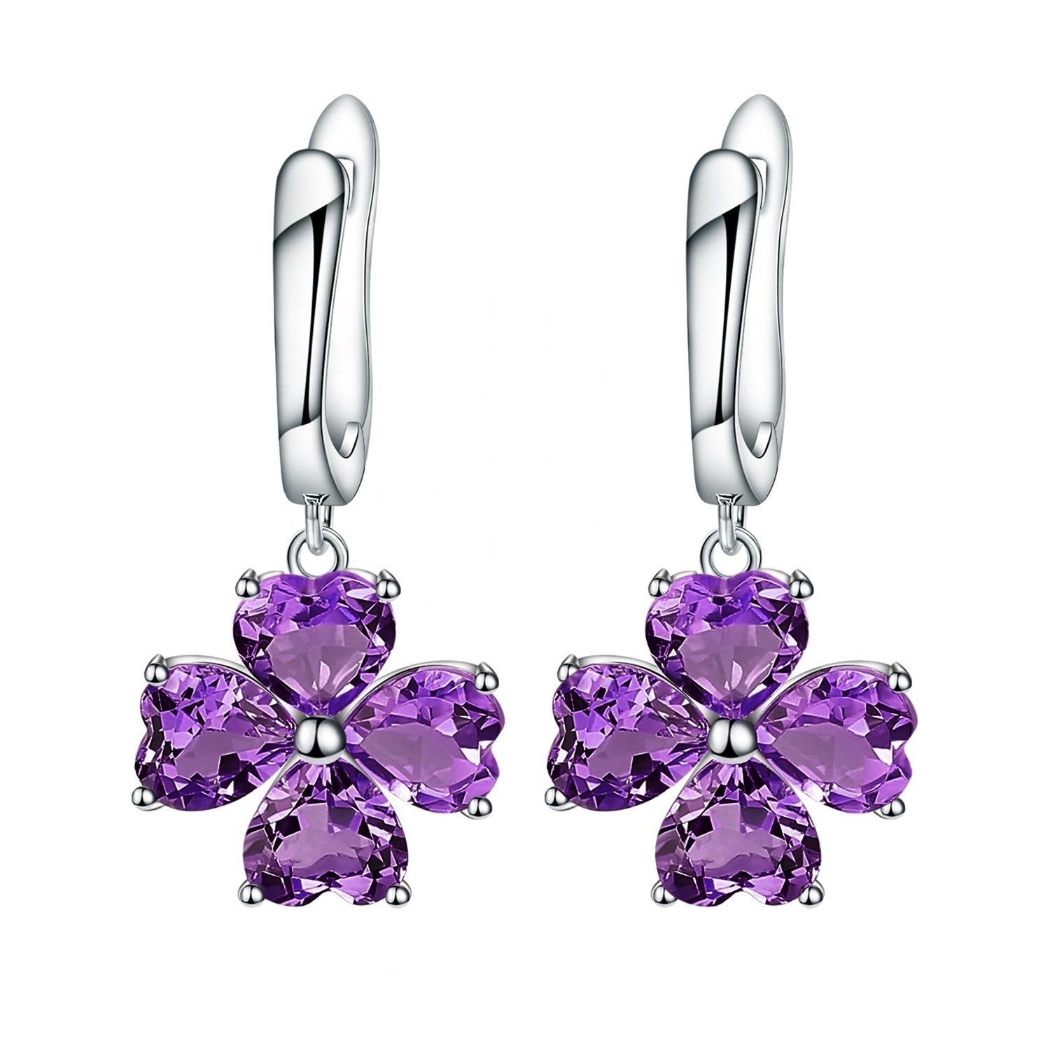 These striking Amethyst clover drop earrings feature four heart-cut gemstones arranged into a graceful floral motif, exuding elegance and romance. Each 0.78ct heart-cut Amethyst glows with a vivid purple hue, representing peace, spiritual clarity, and emotional balance — the treasured virtues of February’s birthstone. Suspended from secure lever-back hooks, the design moves gracefully with the wearer, catching the light from every angle. Crafted in 925 Sterling Silver and enhanced with rhodium plating, these earrings offer lasting brilliance, tarnish resistance, and hypoallergenic comfort.