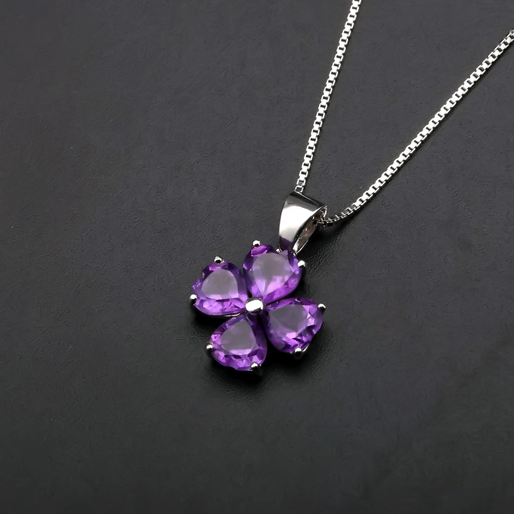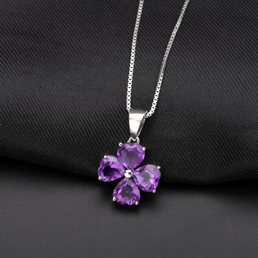 This charming clover pendant features four heart-shaped amethysts, each weighing 0.78ct, arranged in a delicate floral design. Known as the February birthstone, amethyst is believed to bring peace, spiritual balance, and soothing dreams. Suspended from a 45cm sterling silver box link chain, the rhodium-plated finish enhances shine, durability, and comfort.