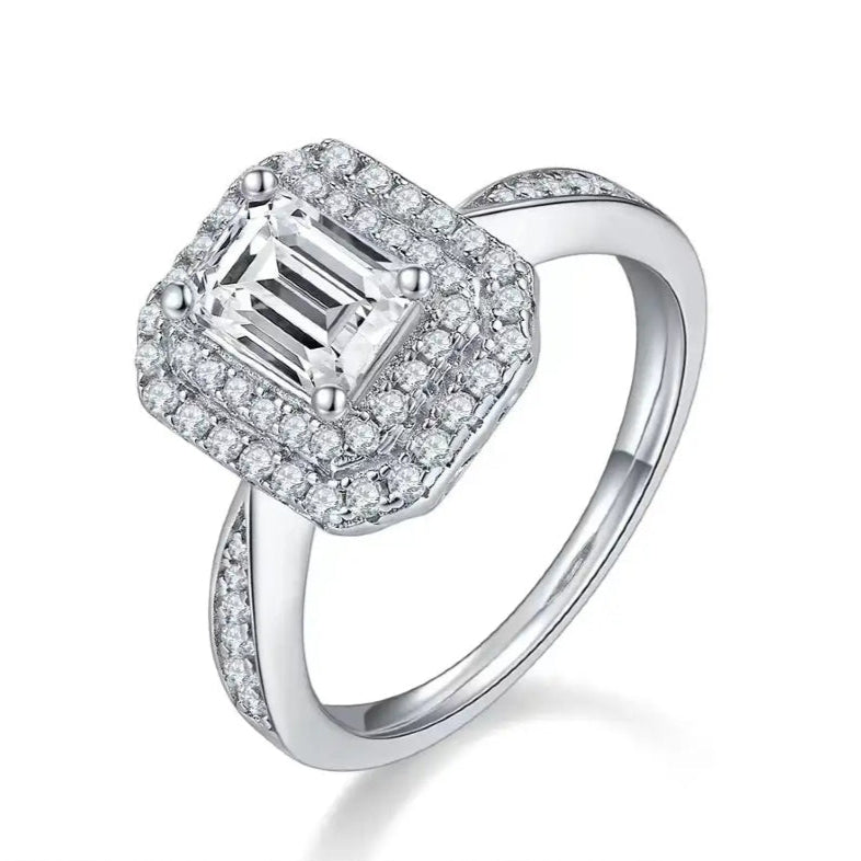 Double Halo 1.00ct Emerald Cut Moissanite Engagement Ring