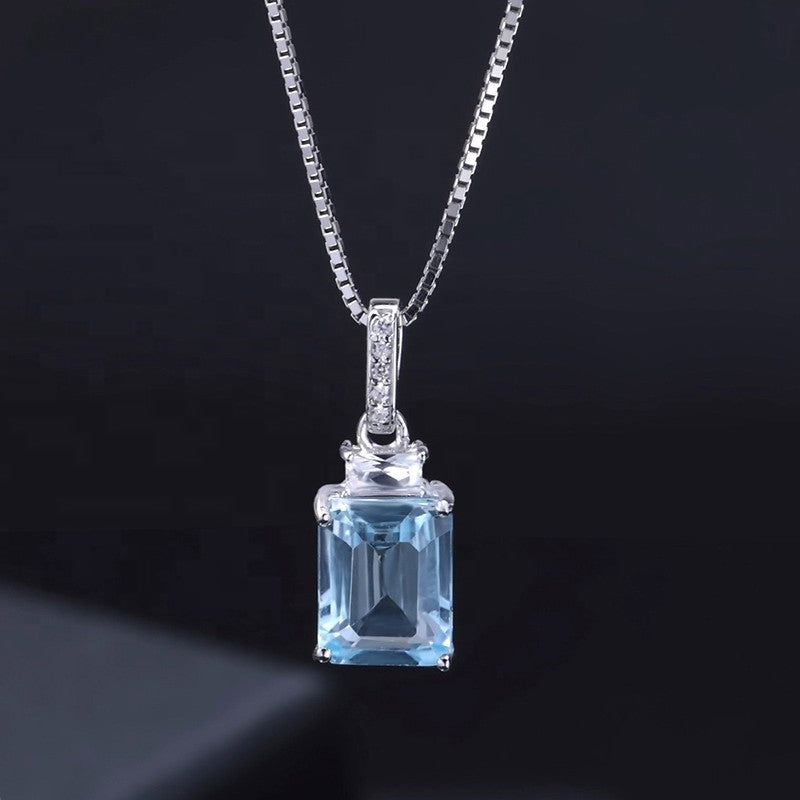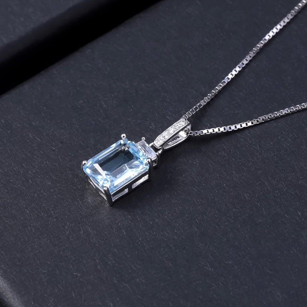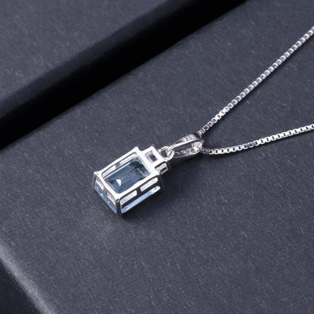 This striking 2.94ct emerald-cut Blue Topaz radiates with an icy, crystal-blue hue that captures light from every angle. Framed by a halo of round brilliant stones, the centre gemstone symbolises love, affection, and clarity of mind. Set in 925 Sterling Silver with a rhodium finish, this pendant offers lasting brilliance, durability, and hypoallergenic comfort, and comes suspended on a 45cm sterling silver box link chain for timeless elegance.