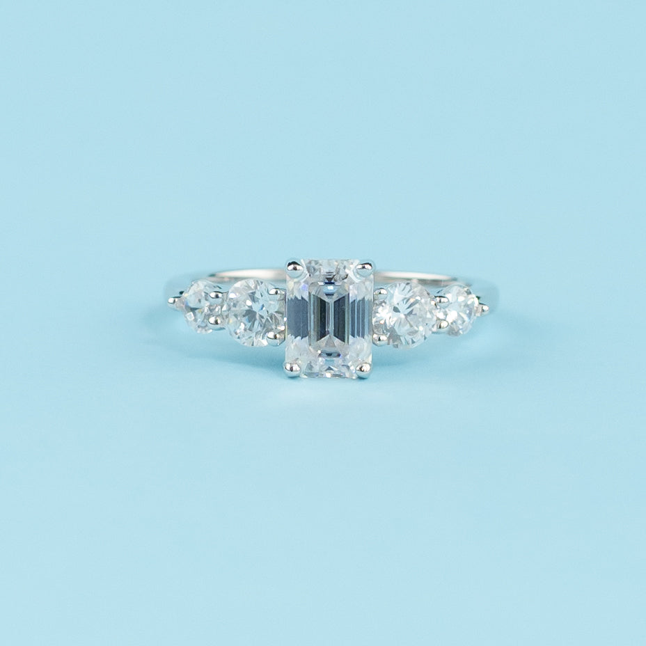 Five-Stone Emerald Cut Moissanite Engagement Ring Set in 9ct White Gold
