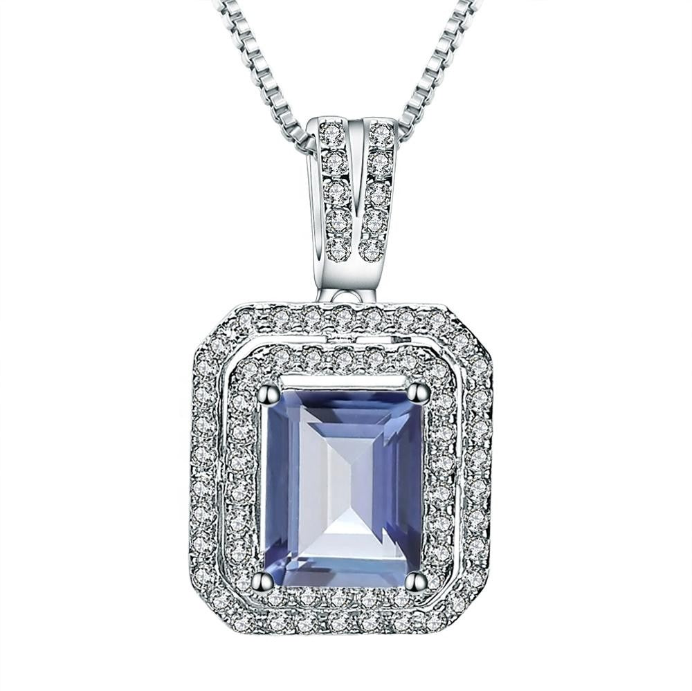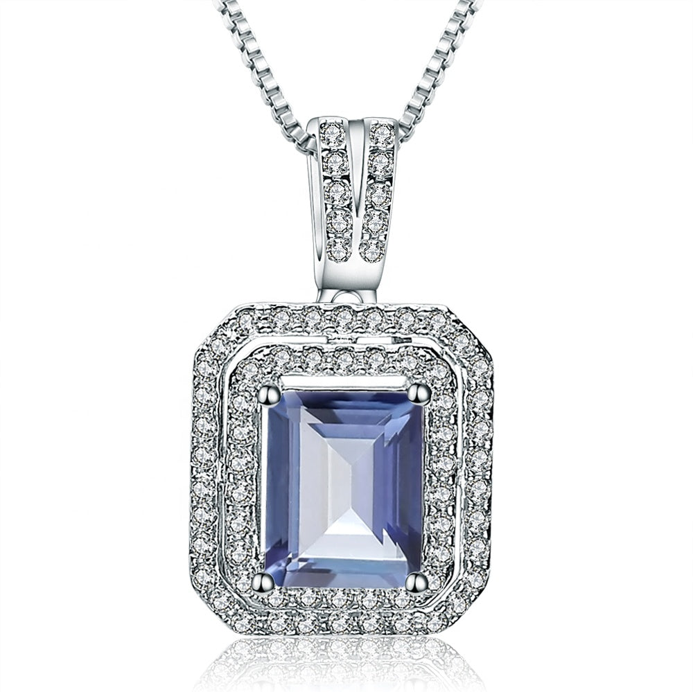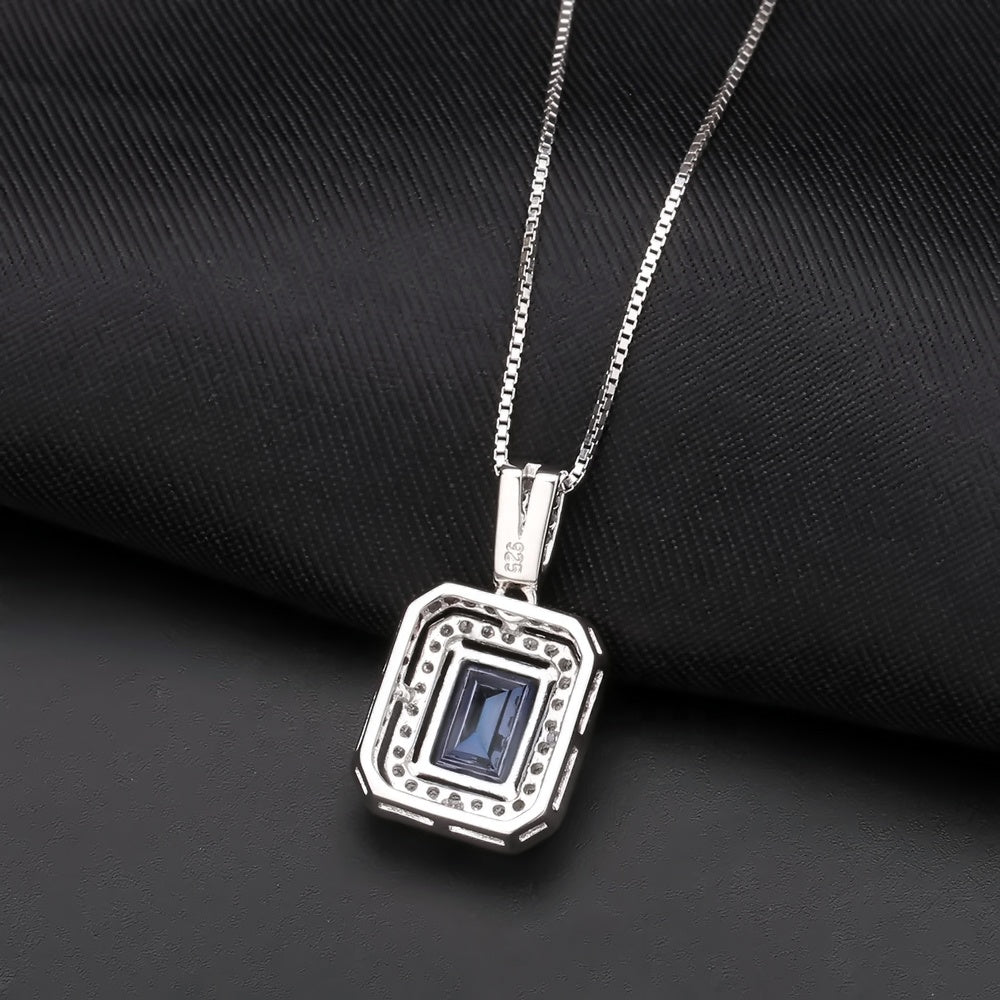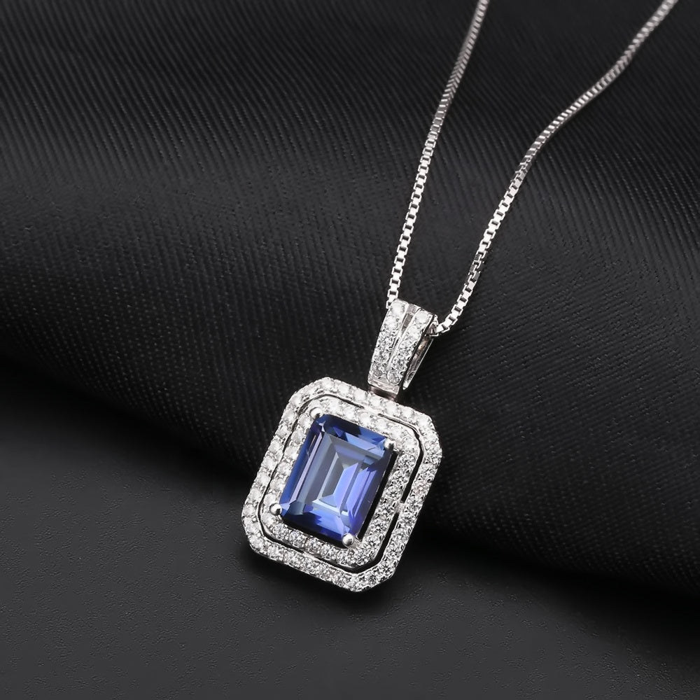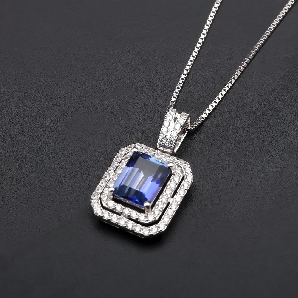 A luminous 2.05ct emerald-cut Mystic Quartz shimmers with shifting violet, teal, and blue tones, symbolising transformation and inner balance. Framed by a halo of round brilliant stones, the centre gem takes on exceptional depth and sparkle. The pendant is crafted in 925 Sterling Silver with a rhodium finish for lasting lustre, durability, and hypoallergenic comfort, and it arrives on a 45cm sterling silver box link chain for effortless elegance.