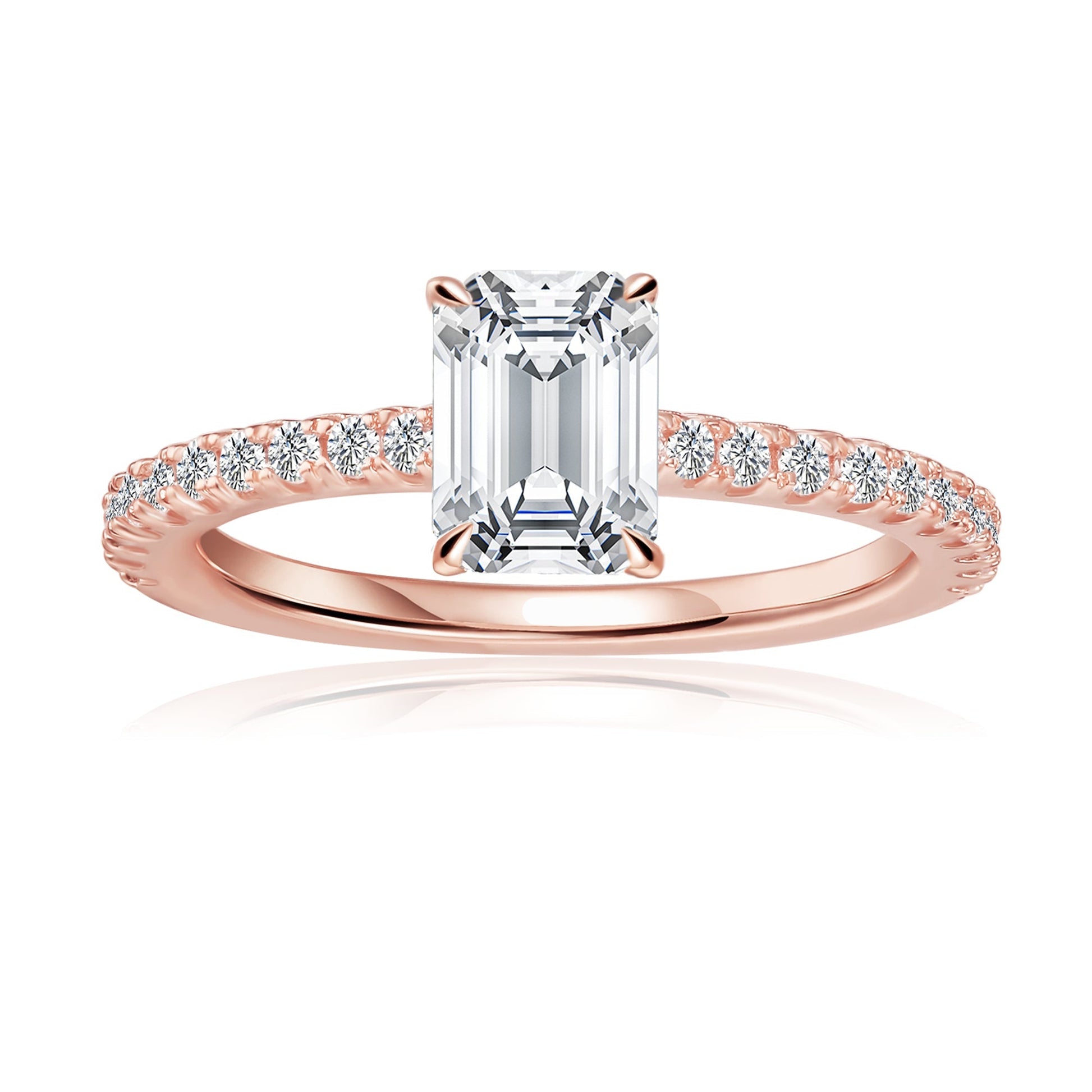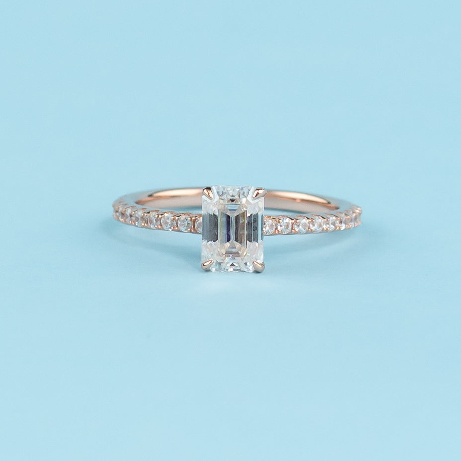 - Center Moissanite: Emerald Cut 1.00ct (7mm x 5mm)