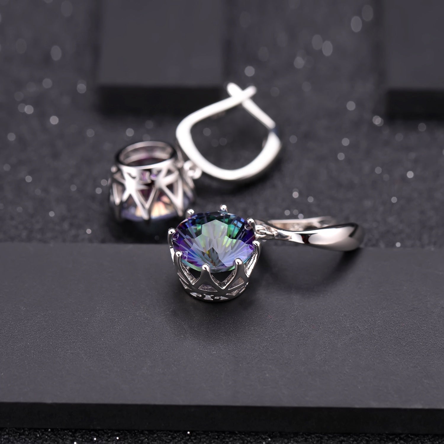 These breathtaking Mystic Quartz drop earrings showcase a kaleidoscope of iridescent hues, shifting effortlessly between violet, blue, and green. Each 12mm round brilliant-cut Mystic Quartz is celebrated for its captivating play of colour and is believed to inspire spiritual strength, enhance intuition, and promote emotional balance. Expertly set in a sleek drop design crafted from 925 Sterling Silver, these earrings are finished with a rhodium-plated polish for lasting brilliance, scratch resistance, and hypoallergenic comfort. The perfect blend of contemporary elegance and mystical charm, they add an unforgettable sparkle to any occasion.