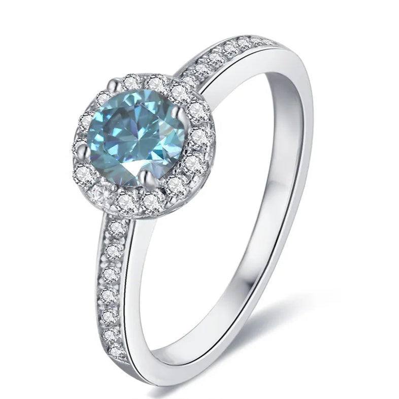 Pave Halo 0.50ct Blue Moissanite Engagement Ring Set in Sterling Silver